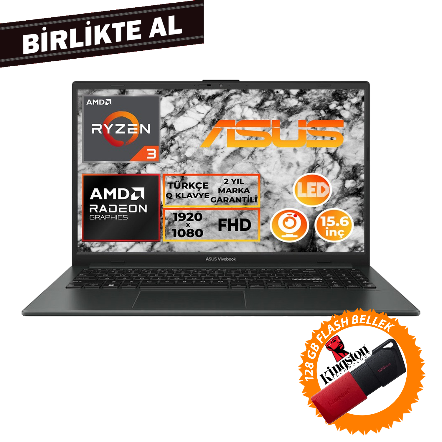ASUS Vivobook Go 15 Ryzen 3 7320U 8GB 512GB SSD 15.6'' FHD Fdos + 128 GB Flash Disk E1504FA-NJ097 017
